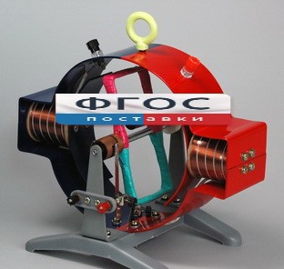 Прибор состоит из статора специальной формы с двумя закрепленными электромагнитами с профильными наконечниками и якоря в виде рамки- катушки на оси с коллектором. На оси рамки-катушки имеются рукоятка для ее вращения вручную и шкив. Статор и рамка окрашены в цвета постоянного магнита. Подаваемое напряжение на обмотки статора и ротора не более 12В (постоянное) и ток не более 2А.