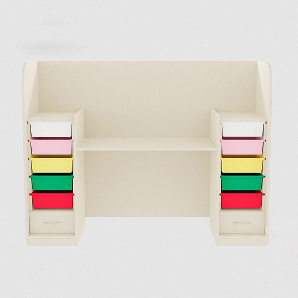 В столе снизу оборудованы четыре небольших выдвижных ящика. Туда можно положит разные маленькие предметы, например, фломастеры, ручки или карандаши. Также туда поместятся блокноты или тетради. Вместо привычных шкафов или полок по бокам сделаны разноцветные выдвижные контейнеры. В них удобно хранить игрушки, вещи, которыми часто пользуются, инвентарь для занятий.