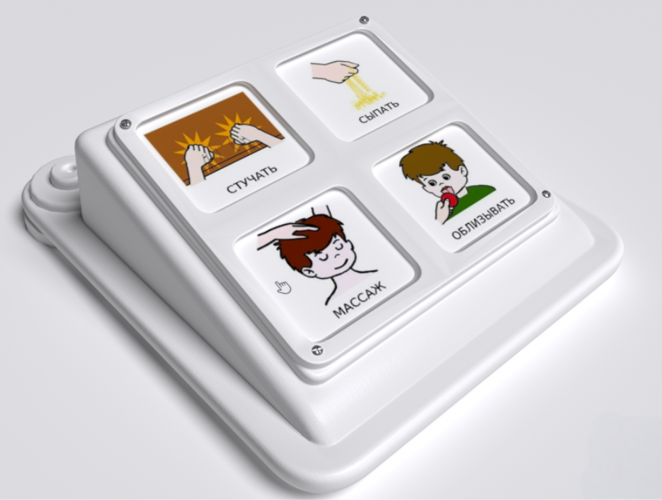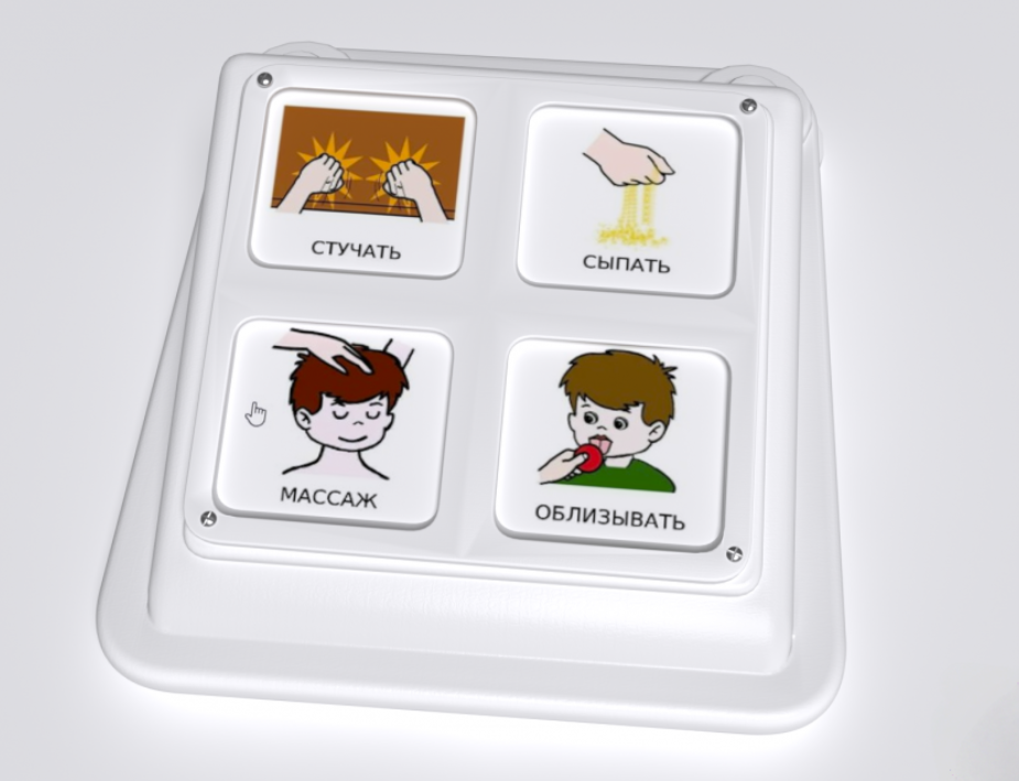 4-х кнопочный игровой коммуникатор №2 предназначен для развития детей, имеющих проблемы со слуховым, зрительным восприятием и коммуникацией (аутизм, СДВГ). Представляет собой квадратный корпус, задняя часть которого слегка возвышена над передней под плавным углом, на котором размещены 4 кнопки с окошками, которые предназначены для сменных картинок с надписями. Изготовлено из высококачественного ударопрочного пластика, имеет обтекаемые плавные формы без острых краёв и углов.