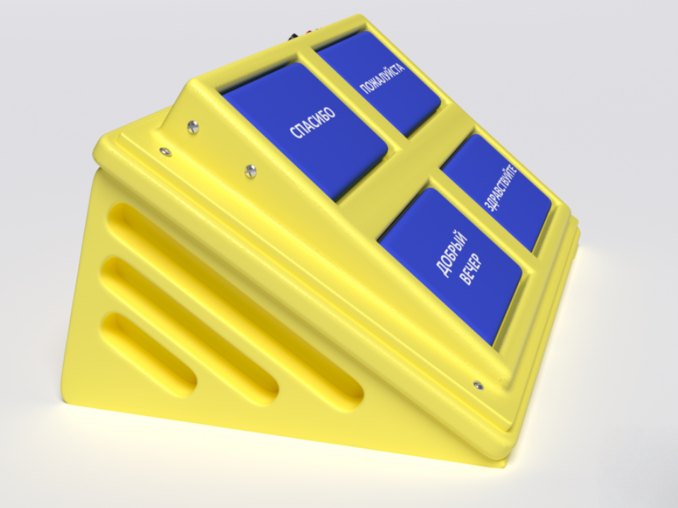4-х кнопочный игровой коммуникатор предназначен для развития детей, имеющих проблемы со слуховым, зрительным восприятием и коммуникацией. Представляет собой квадратный корпус, задняя часть которого слегка возвышена над передней под плавным углом, на котором размещены 4 кнопки с надписями: «Спасибо», «Пожалуйста», «Добрый вечер», «Здравствуйте». Изготовлено из высококачественного ударопрочного пластика, имеет обтекаемые плавные формы без острых краёв и углов. Есть возможность подключения до 4-х выносных кнопок.