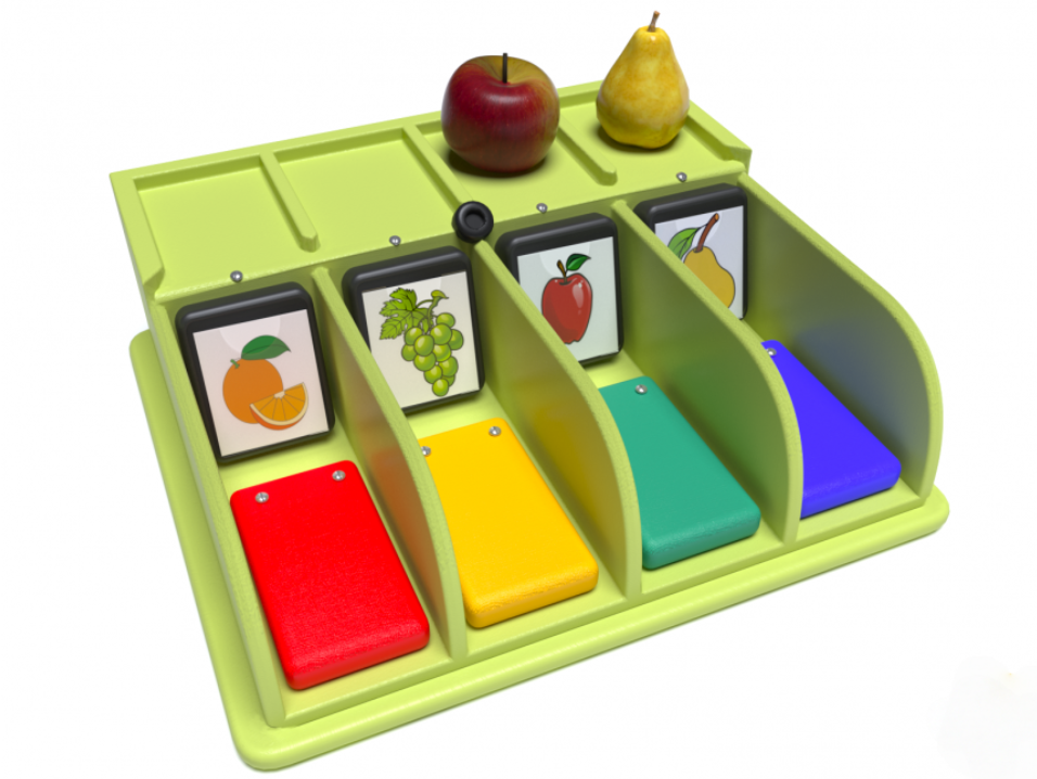 При помощи этого коммуникатора дети учатся определять и называть предметы повседневного обихода. Муляжи фруктов следует поместить в ячейки на возвышении корпуса коммуникатора. Затем ребенок вставляет карточку с соответствующим изображением в окошко и нажимает на кнопку – воспроизводится записанное ранее сообщение. Также это задание можно выполнять в обратном порядке, подбирая фрукты к заранее помещенным в окошки карточкам.