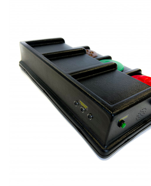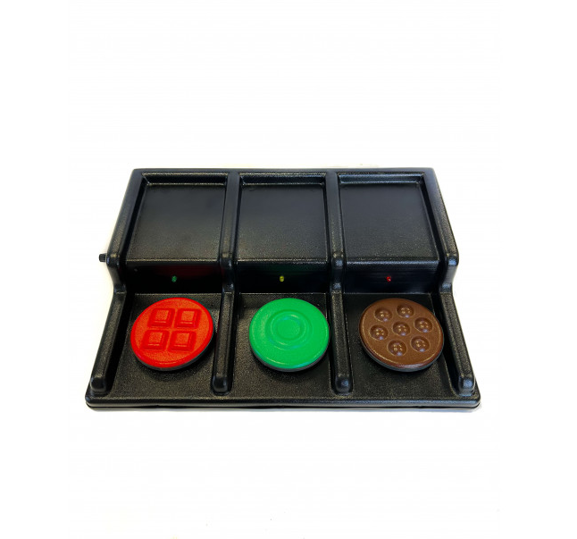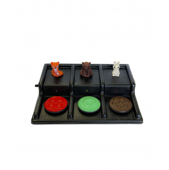Коммуникатор этой модели имеет 2-х ступенчатую конструкцию: на нижней ступени расположены кнопки, верхняя же предназначена для размещения объемных предметов для изучения. Держатели для карточек в количестве 3 штуки помогают размещать и демонстрационные картинки с надписями или без, а также слова. Для каждой кнопки можно записать по одному сообщению до десяти секунд каждое. Данный аппарат подходит для проведения занятий по любому предмету, в котором могут быть задействованы наглядные материалы. При нажатии на кнопку сообщение воспроизводится и загорается свет. Подобные устройства имеют большую популярность во многих реабилитационных и коррекционных учреждениях нашей страны. Они во многом упрощают работу специалистов и делают ее более эффективной. Что касаемо людей с ограниченными возможностями, коммуникаторы способны подарить им веру в собственные силы, которая побуждает их развиваться и достигать новых высот.