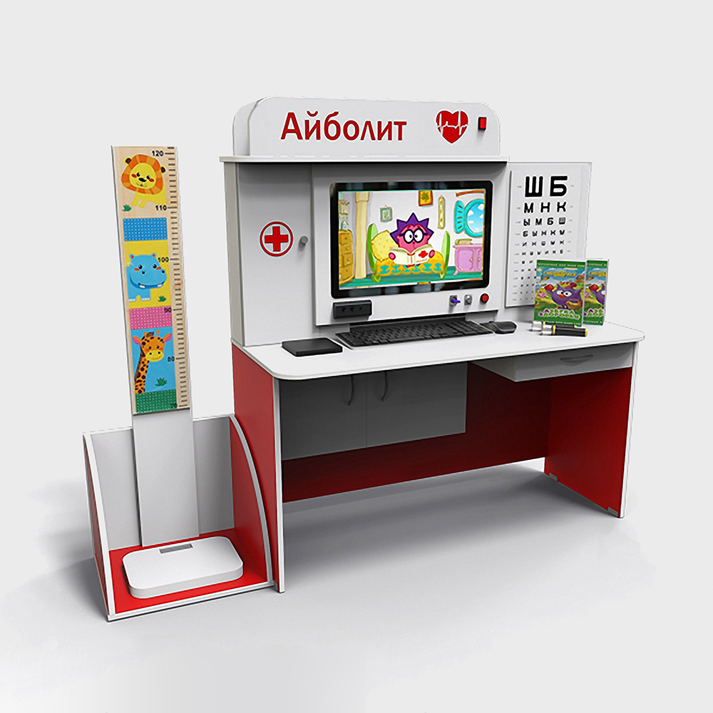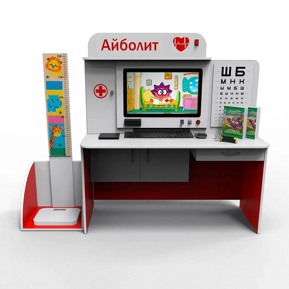 Мультимедийный стол выполнен из безопасного материала ЛДСП. Он оснащен интерактивным монитором размером в 25" дюймов с технологией Multi Touch System, которая поддерживает до 10 касаний. В комплектацию входят акустика, современный компьютер, радиосистема на 2 микрофона, клавиатура, мышь, кабели HDMI, Usb 2.0. Помимо этого, в наличии рециркулятор, ростометр, весы и таблица Сивцева, чтобы проверять зрение у детей. Для складирования разных дидактических материалов имеется небольшой ящик и шкафчик.