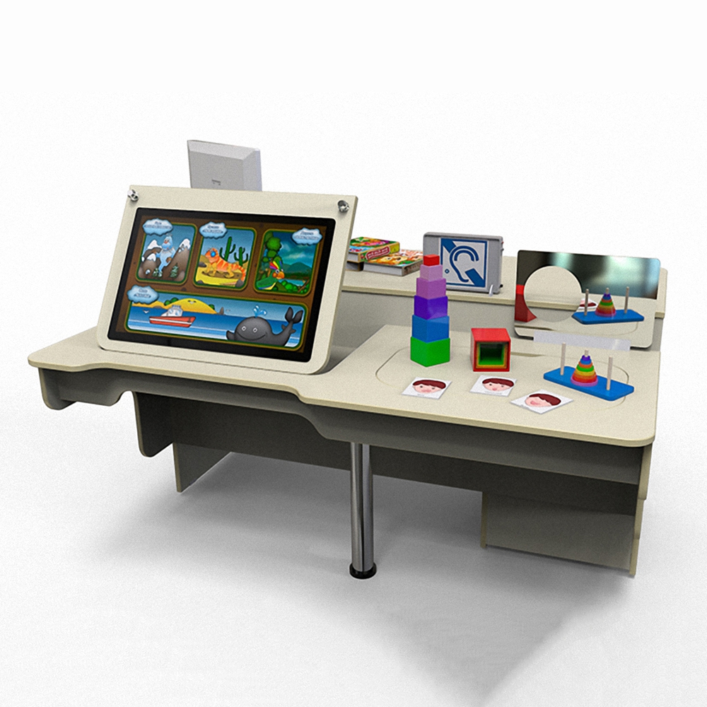 Стол дефектолога в виде классической корпусной мебели с вмонтированной интерактивной системой и двумя рабочими местами (для учителя и ученика). На рабочем месте учителя установлен производительный персональный компьютер с монитором 22 дюйма (за производительность отвечает: ЦП – Intel Core i3 2.13GHz, ОЗУ – 4Gb DDR4-1600, SSD – 120Gb) на месте ученика вмонтирован планшет с большим сенсорным 25 дюймовым экраном, поддерживающим до 10 одновременных касаний.