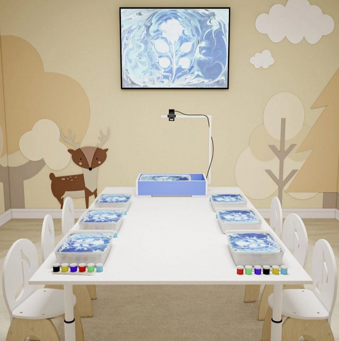 Готовая студия аква-анимации "Акватория" — идеальное решение для организации творческой мастерской по рисованию на воде техникой Эбру. Стол имеет большой поддон для рисунков формата А3.